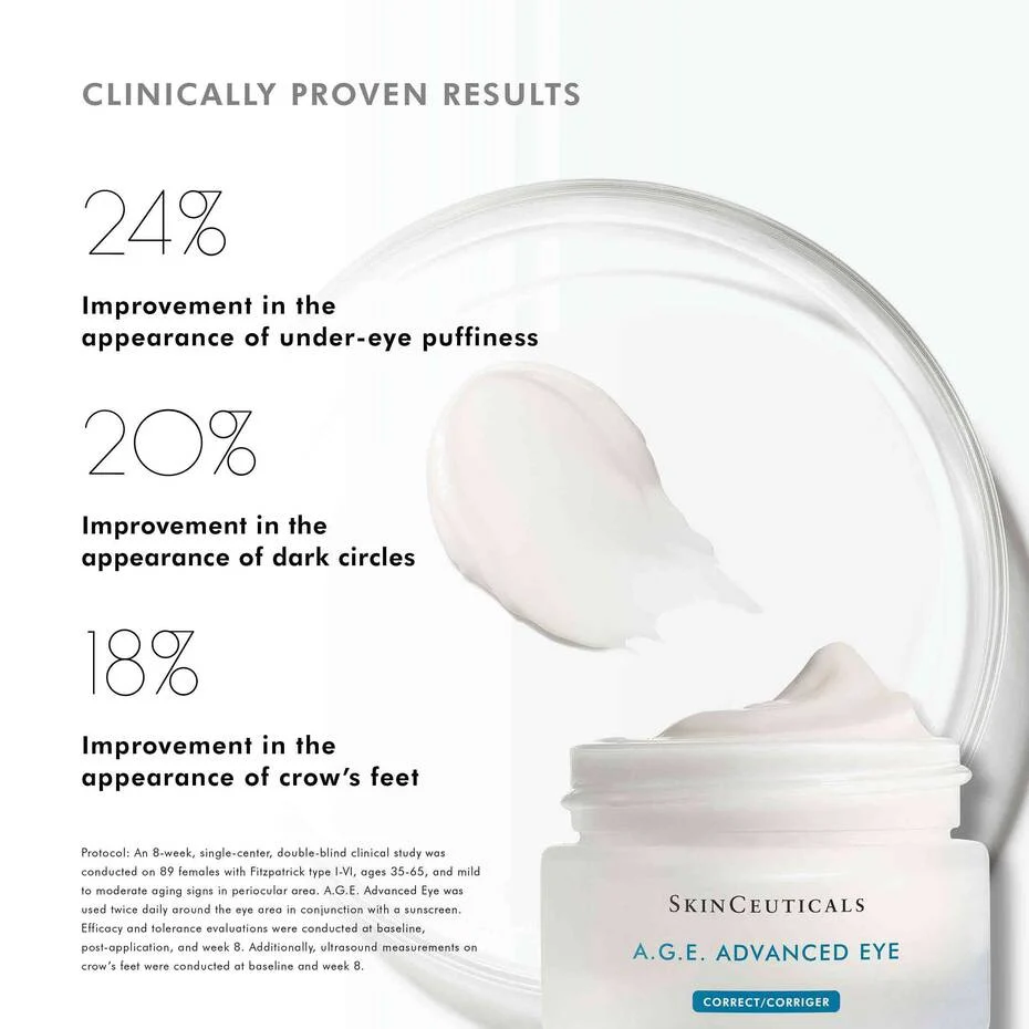 A.G.E. Advanced Eye is an advanced next-generation eye cream for wrinkles that fights the appearance of dark circles, crow’s feet lines, and puffiness, caused by advanced glycation end-products (A.G.E.s), a major factor of the natural aging process. This silky under- eye cream for crow’s feet is formulated for the delicate eye area with a potent combination of ProxylaneTM, a concentrated flavonoid blend and Matrixyl 3000. This eye cream for dark circles also includes glycyrrhetinic acid, caffeine, and an inclusive blend of optical diffusers to disperse light and immediately improve the radiance of tired dull-looking eyes across all skin tones.